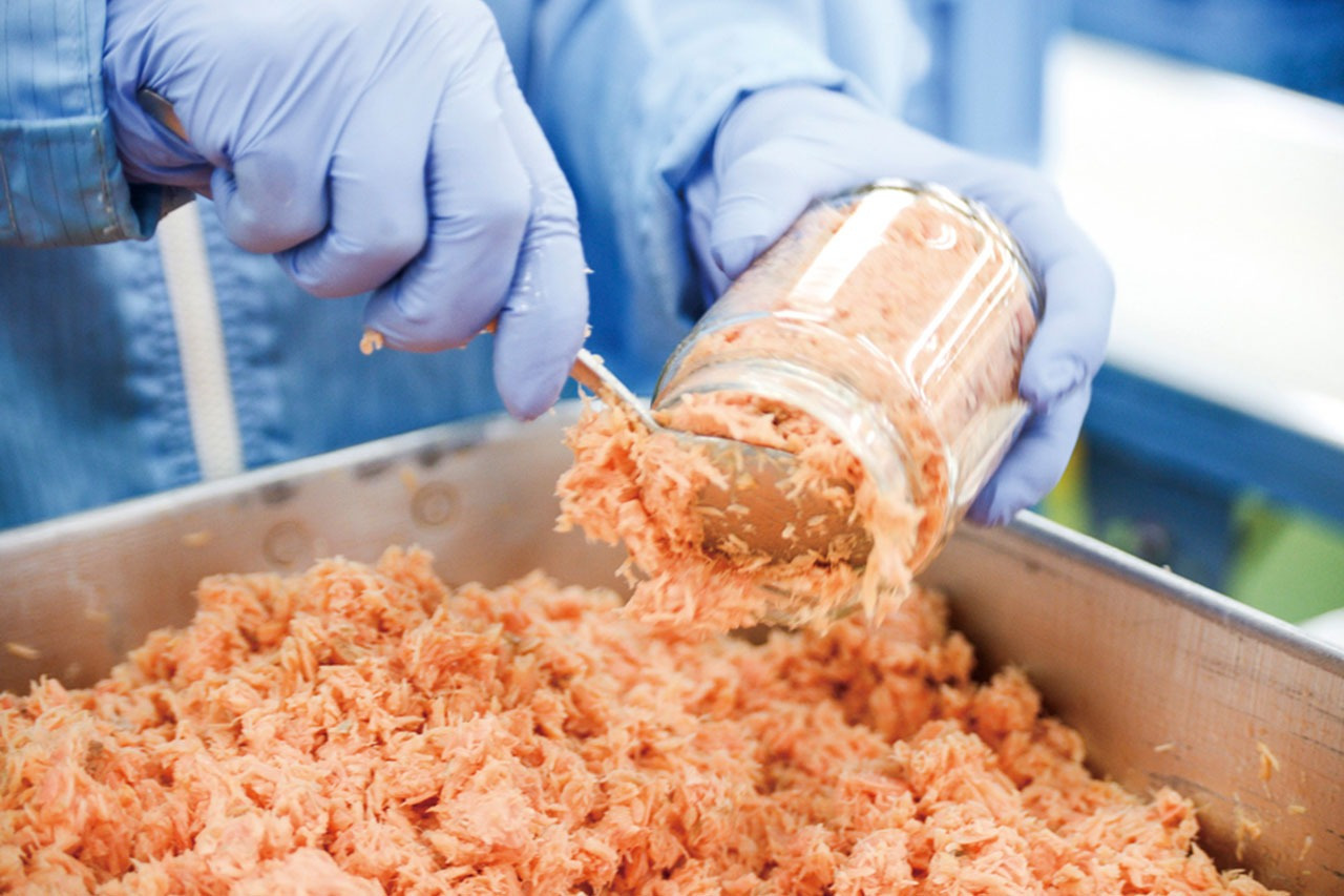 1尾1尾の鮭を大切にした製造の仕方も特長です。こちらは、ほぐした鮭の身から、細かい小骨を丁寧に取り除き、手作業で1つひとつ瓶詰めしていくところ。とてもコストのかかる製造体制ですが、こうした行程を丁寧に経ているからこそ、高品質でおいしいさけ茶漬が出来上がるのです。