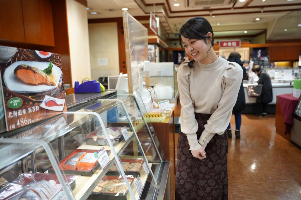 日常の食卓を彩る「地域の台所」としても地域の方から愛されています。店舗に入って右側は、惣菜や鮭の切身パックや数の子など冷蔵食品を扱うコーナーになっています。夕方になると、地元市民の方で大賑わいに。