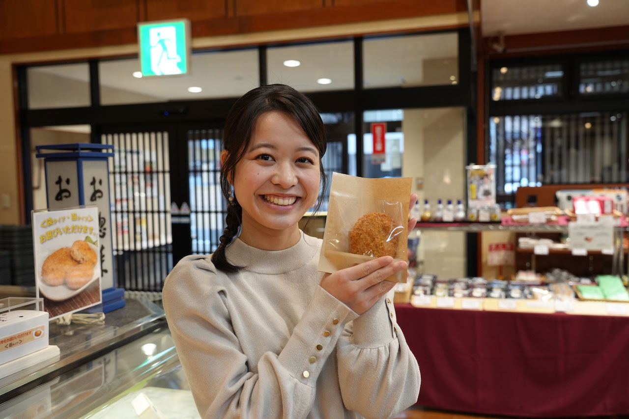 加島屋本店だけでしか買えない、おすすめ商品も!本店を訪れたなら、ぜひ購入していただきたいのが惣菜です。こちらは、その中でも1番人気の「キングサーモンコロッケ(195円 / 1個)」。