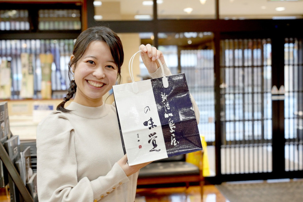 おいしい商品の数々だけでなく、忘れてはいけない存在があります。それが、加島屋さんのバッグ!もしかすると、新潟県外にお住まいの方も、一度は見たことのある方がいるかもしれません。少し光沢があるのは、なんと、撥水コーティングが施されているため。「天候が優れないことの多い歳末期などでも大切な商品が濡れないように」という心配りから誕生しました。頑丈さもあって、中には日常使いする方も。遠くから見ても「加島屋さんのバッグ」とひと目でわかるブランド性も魅力です。