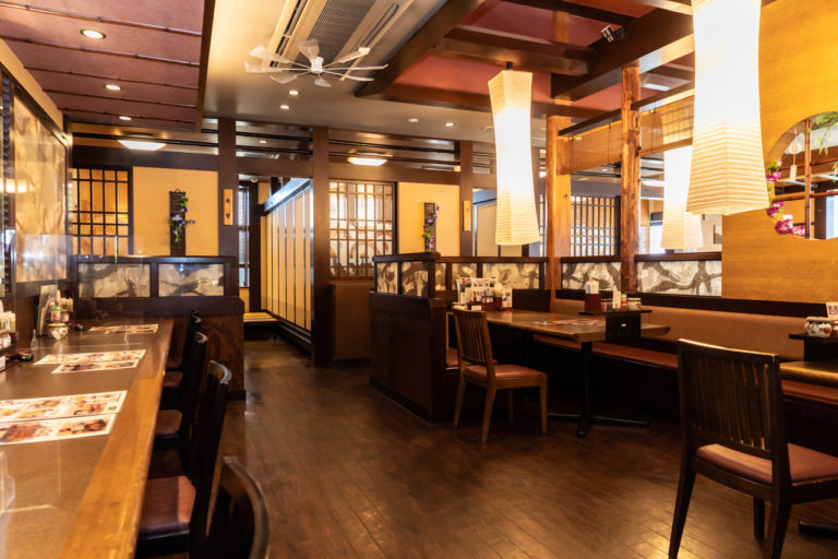 店内は古民家風のゆったりとした空間。テーブル席の他、小上がりやカウンター席などもあり様々なシーンで使われています。