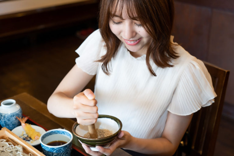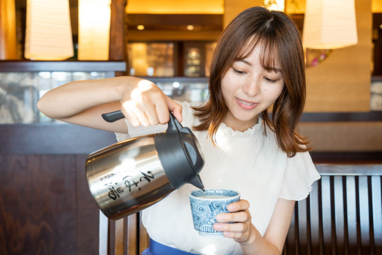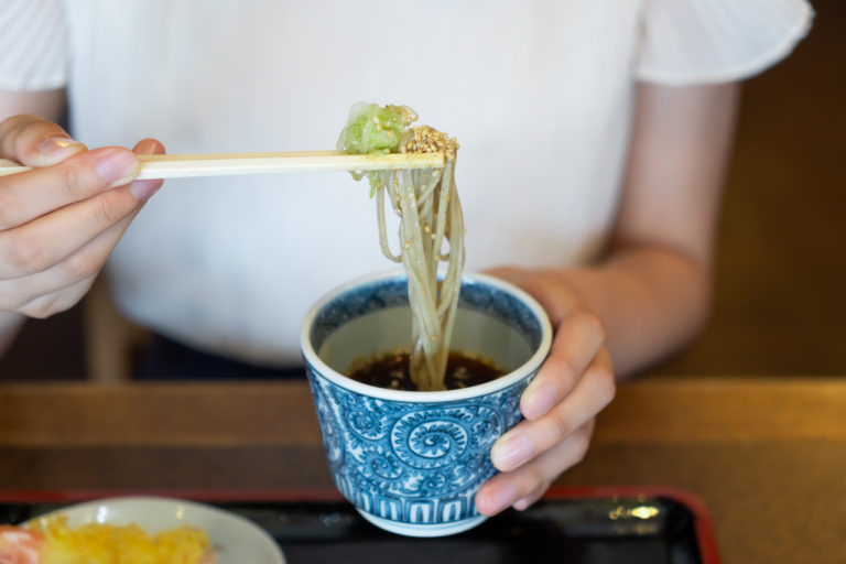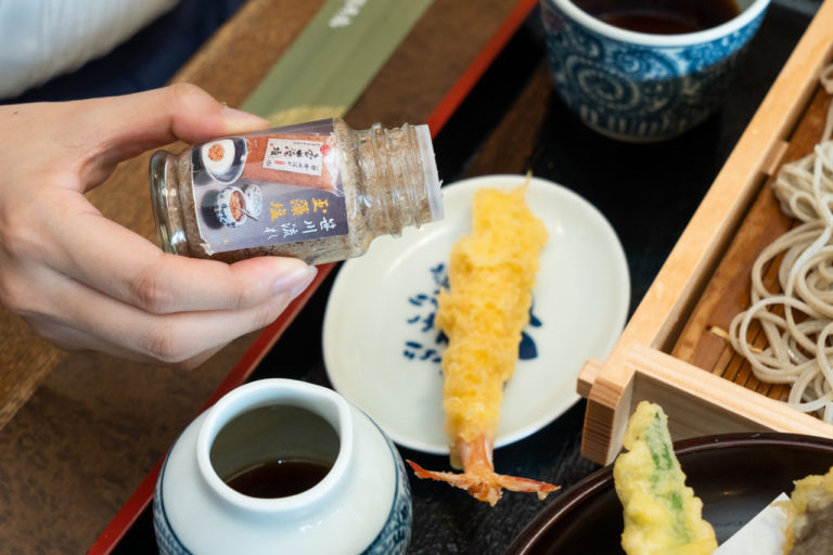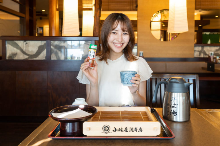 食後は残ったつゆにそばのゆで汁を注いでいただく「そば湯」が欠かせません。薬味の「ゆず七味」を入れることでピリッとした辛味とゆずの香りがアクセントになり、そば湯の風味が一層引き立ちます。