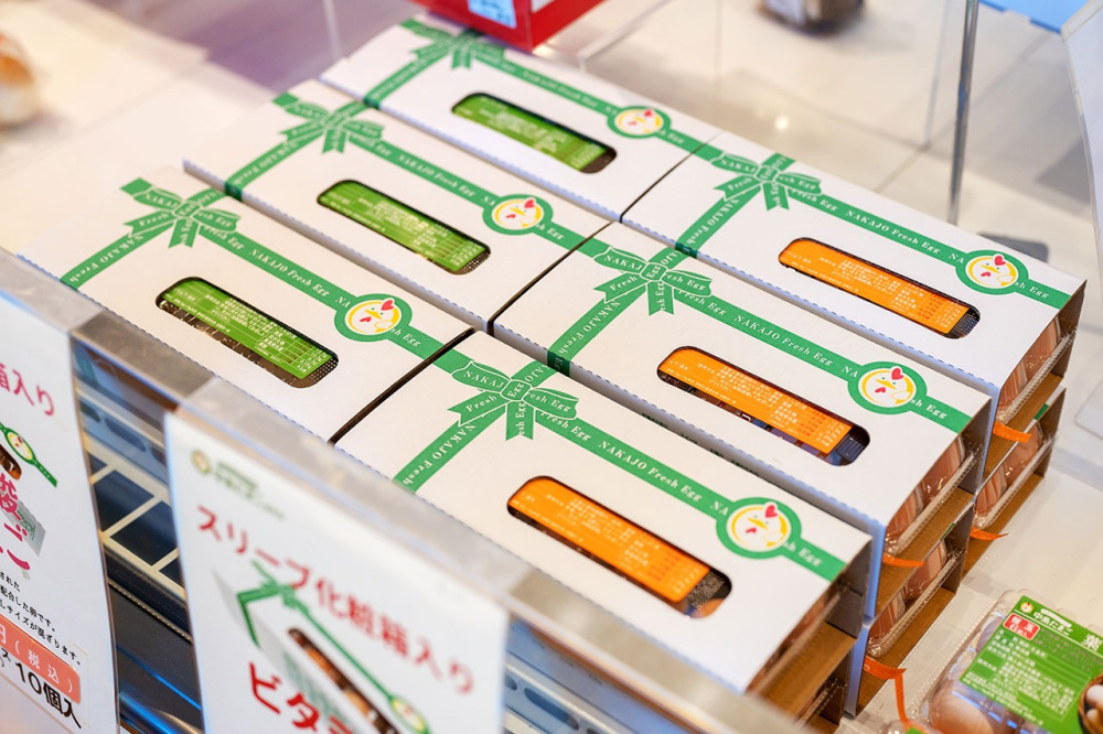 店内には、新潟県胎内市にある自社農場で朝一番に採れた卵が並びます。農場のある中条は、海や山に囲まれた場所。自然豊かな環境で、鶏は健康に気を配り病気やストレスに注意しながら大切に育てられています。