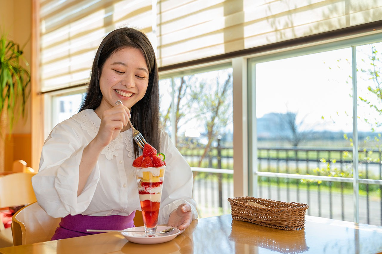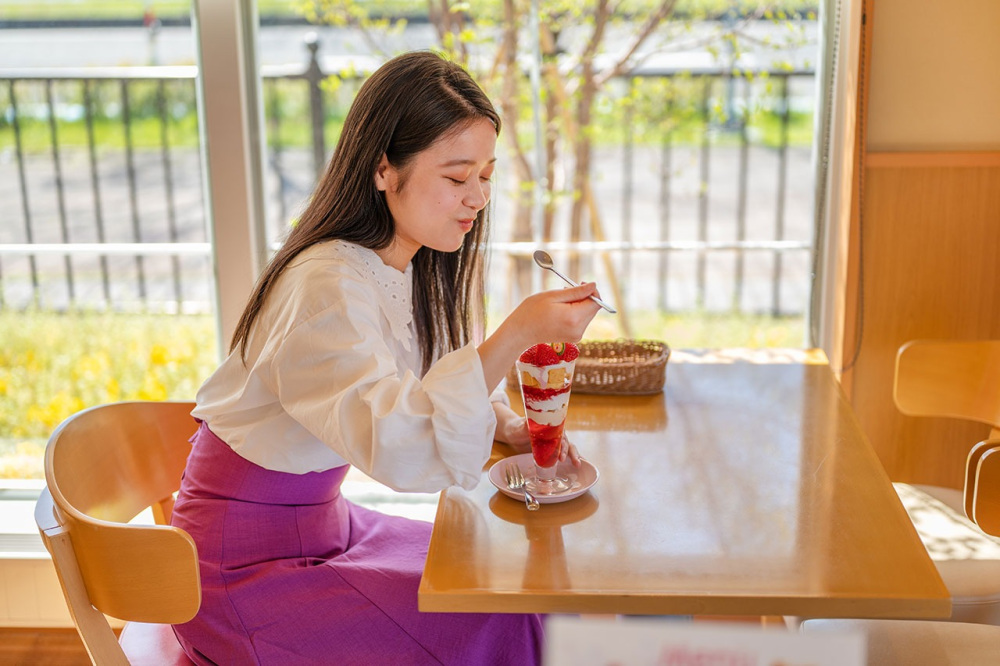 第13代にいがた観光親善大使の矢部さんと訪れたのは、新潟市中央区にある「たまごsweets cafe 中条たまご直売店」。農場直売の新鮮なたまごを買えるだけでなく、旬のフルーツを使ったパフェを食べられると人気のお店です。