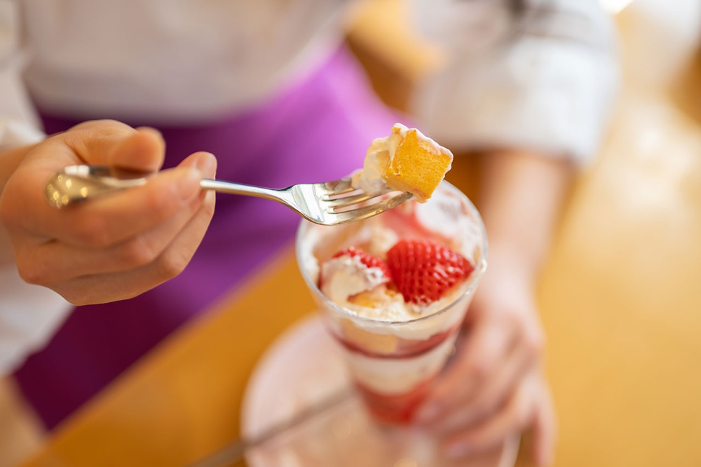 果物はできるだけ新潟県産にこだわり、春は新潟のブランドいちご越後姫を使用しています。熟度の見極めが大切なため、県内の果樹園には一番美味しい時期に収穫してもらうそう。食べ頃を迎えた苺はジューシーで甘みが強く生クリームと相性抜群!