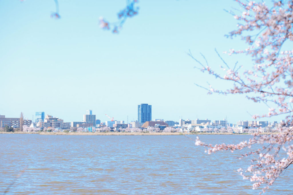 鳥屋野潟沿いは桜の名所。対岸にも満開の花を見ることができます。冬は白鳥の飛来地になっていることもあり、野鳥が飛んでいる様子を見ることも。