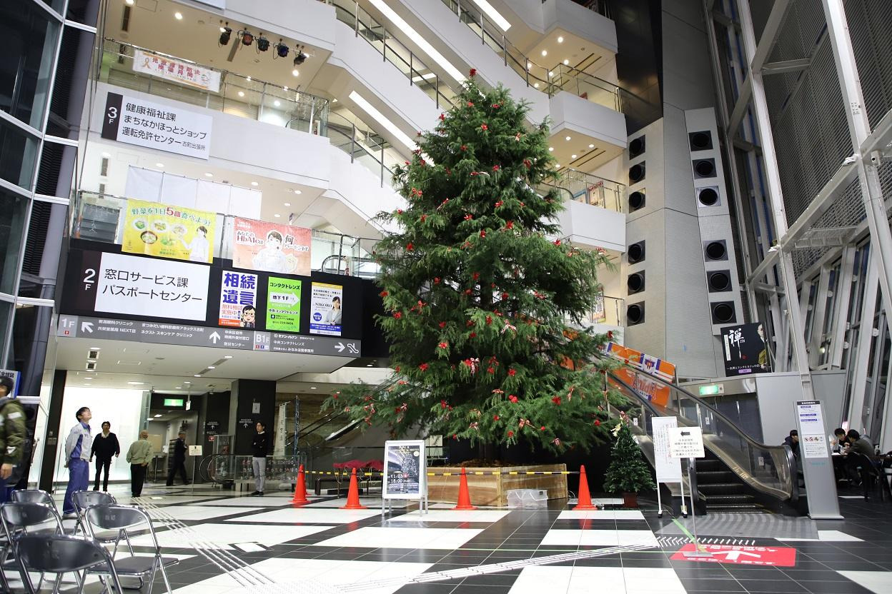 NEXT21の1階アトリウムに、今年もクリスマスツリーが登場します。本物の生木を使用したツリーの高さは約6メートル、約20,000球のLED電球で美しく輝きます。