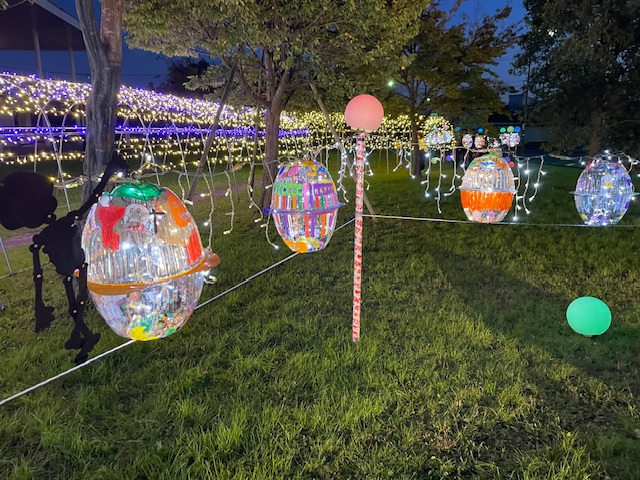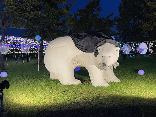 今年も新潟市北区文化会館前の豊栄メモリアルガーデンがひかりの森に変身し、恒例のシロクマが帰ってきました。今年のテーマは「ハロウィン」です。葛塚東小学校の児童と一緒に作製したジャック・オー・ランタンが豊栄を明るく照らしています。みなさんもイルミネーションであったかい、ぽかぽかの気持ちになってください!