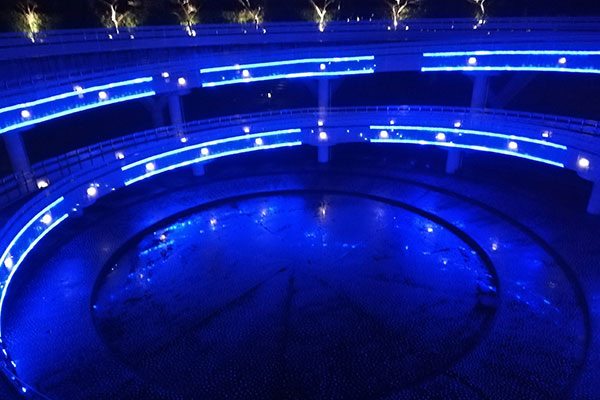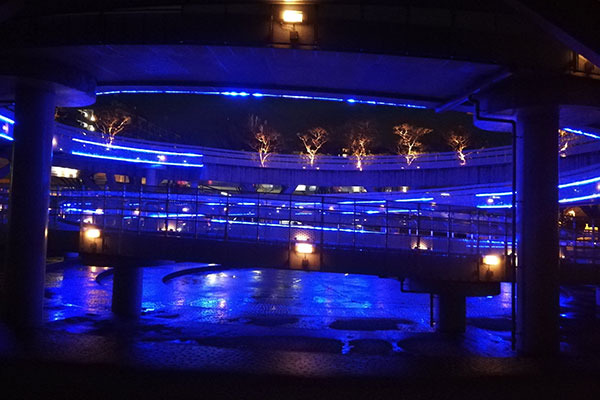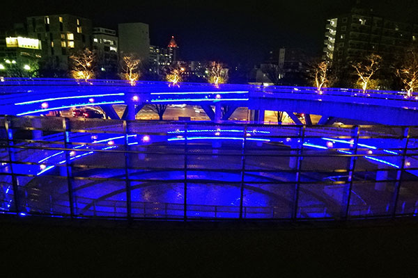 白山公園空中庭園のやすらぎ堤側をライトアップしています。ブルーにライトアップされた螺旋状の遊歩道はとても幻想的です。