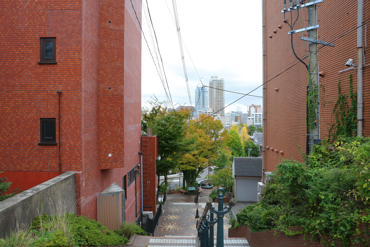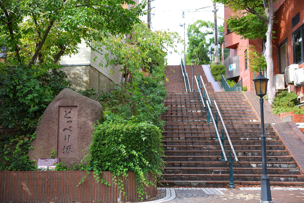 レンガ調の階段が特徴のどっぺり坂。西大畑は砂丘地帯のため坂道が多く、どっぺり坂もその一つ。