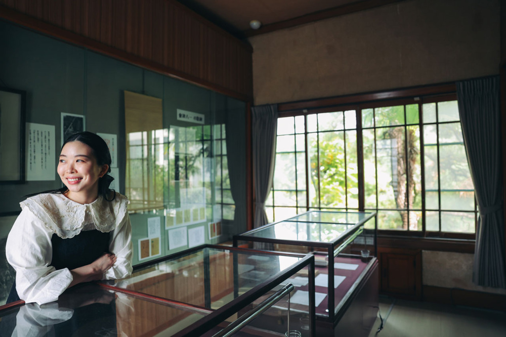 敷地内に併設する洋館には、新潟出身の文人會津八一が終の棲家として晩年の10年間暮らしていました。展示室には八一の歌書や良寬の書などが展示されている他、八一が当時使用していた机なども見ることができます。庭にある八一の歌碑にも注目です。
