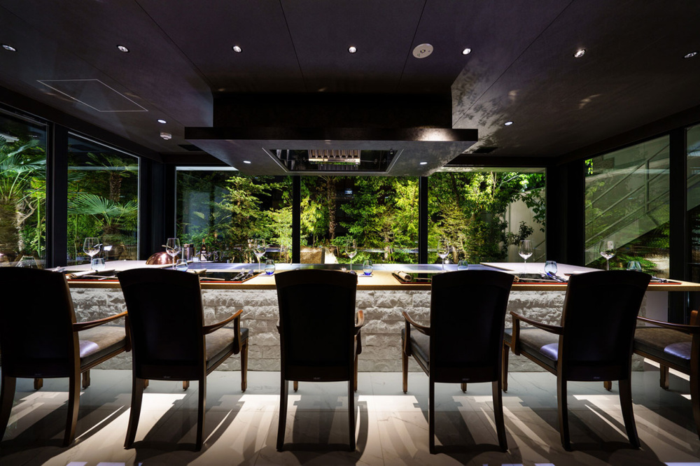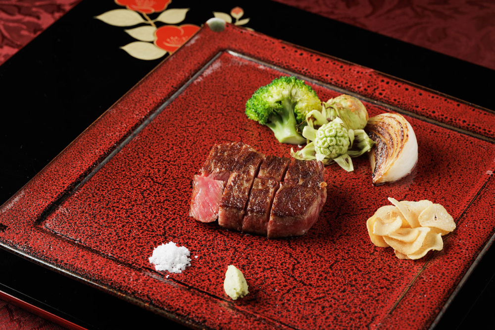 建築当時の趣を再現したレトロモダンな店内には、日本庭園を臨む鉄板カウンター席のほか、特別感あふれる個室も完備。指定牧場の厳選した和牛や新鮮な魚介類を使った料理を堪能できます。