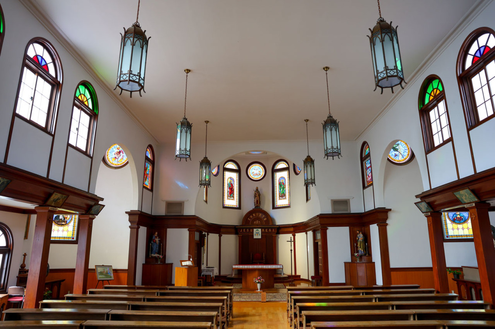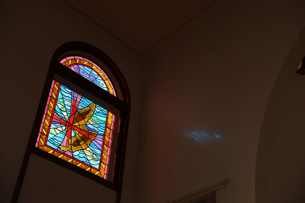 聖堂を囲むように取り付けられたステンドグラスはフィレンツェ製で、新潟地震で沈下した聖堂を平成8年に修復した際、フランシスコ会から寄贈。佐渡の無名殉教者など、新潟教区らしい絵柄が特徴です。
