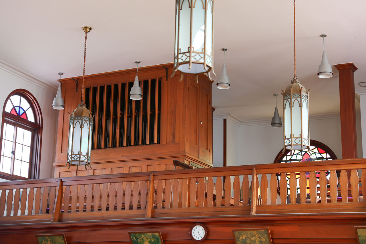 2階にあるのは、空気アクション式パイプオルガン。日本で現役として使われている最古のものの一つだそう。昭和4年の設置以来ミサなどの場面で使用されています。