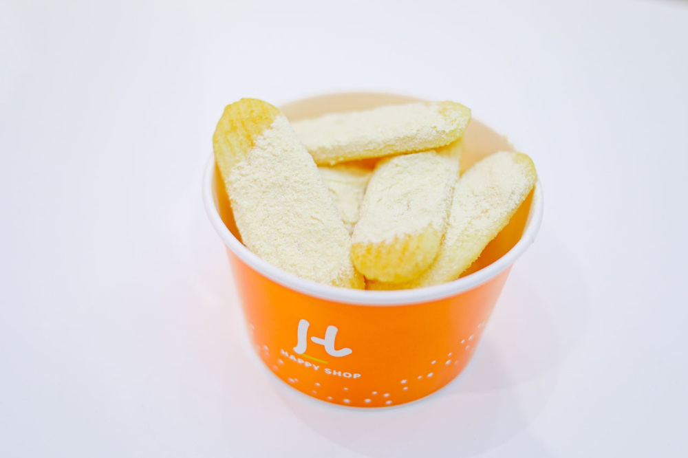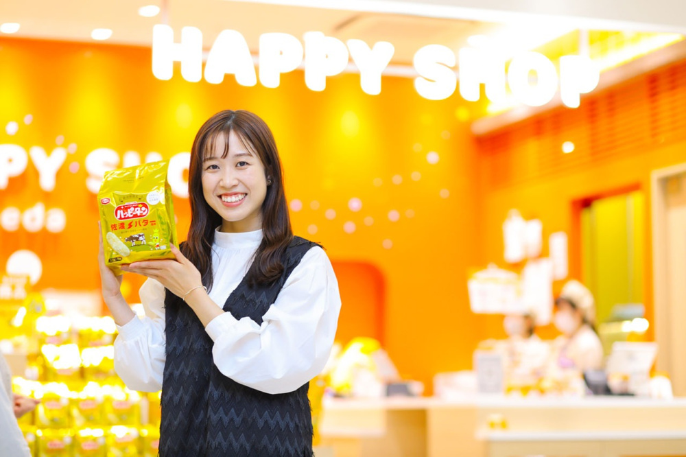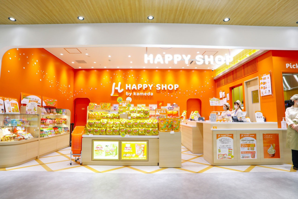 柿の種などで知られる「亀田製菓」が送るハッピーターン専門店「HAPPY SHOP」。店内で焼いたサクサクのハッピーターンなどを楽しめます。
