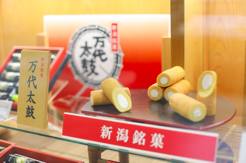 看板商品「万代太鼓」は、伝統芸能をモチーフにした小型バウムクーヘン。ソフトクッキー生地とさっぱりクリームの相性が抜群です。他にも、「流れ梅」「雪國」「月の宿」など、新潟の風土や文化を表現した銘菓が並びます。季節限定の「ル レクチエ」や「いちごクリーム」も見逃せませんよ。