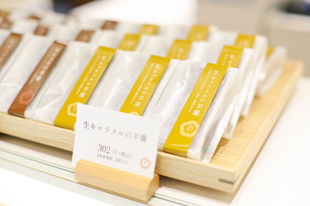 看板商品「生キャラメルの羊羹」は、佐渡バターと自家製生キャラメル、白餡を使用した逸品。キャラメルの香ばしさと白餡の優しい甘みが絶妙なバランスで、乾燥イチジクがアクセントに。柔らかく滑らかな口当たりで、数々の賞を受賞した自慢の一品です。
