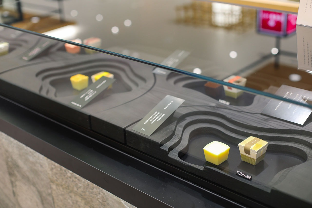 印象的なショーケースが目を引く「升升一升」は、新潟県の日本酒を使用した「酒菓子」の専門店。テリーヌショコラやプリン、季節のフルーツを使用したスフレなど、様々なお菓子が並びます。