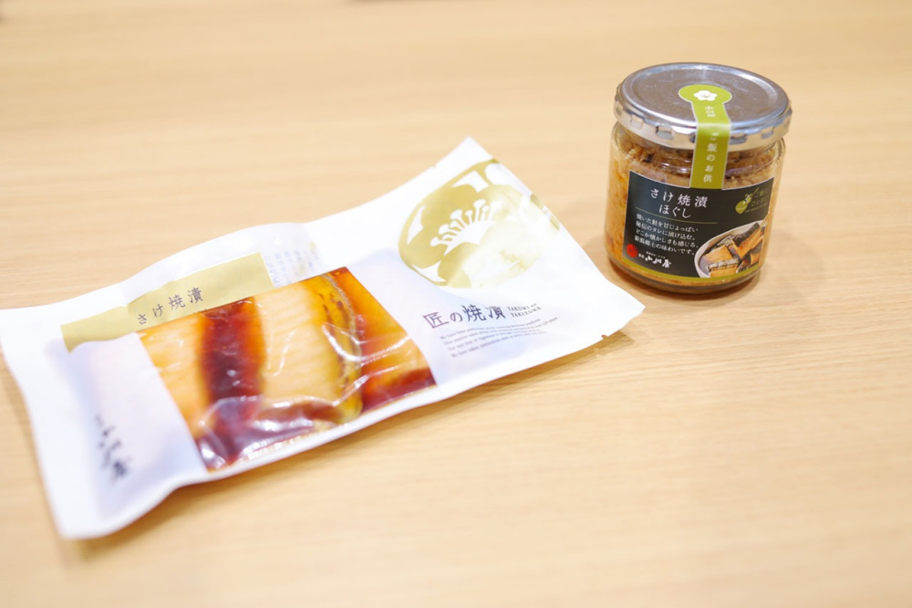 明治26年創業の小川屋は、新潟の郷土料理「さけの焼漬」を看板商品に、新潟らしいお土産を取り揃えています。「さけの焼漬」は、焼いたさけをこだわりの醤油ベースのたれに漬け込んで作ります。煮魚のような食感と甘じょっぱい味付けが、ご飯との相性抜群。ほぐした焼漬は瓶詰めでも販売され、手軽に楽しめますよ。