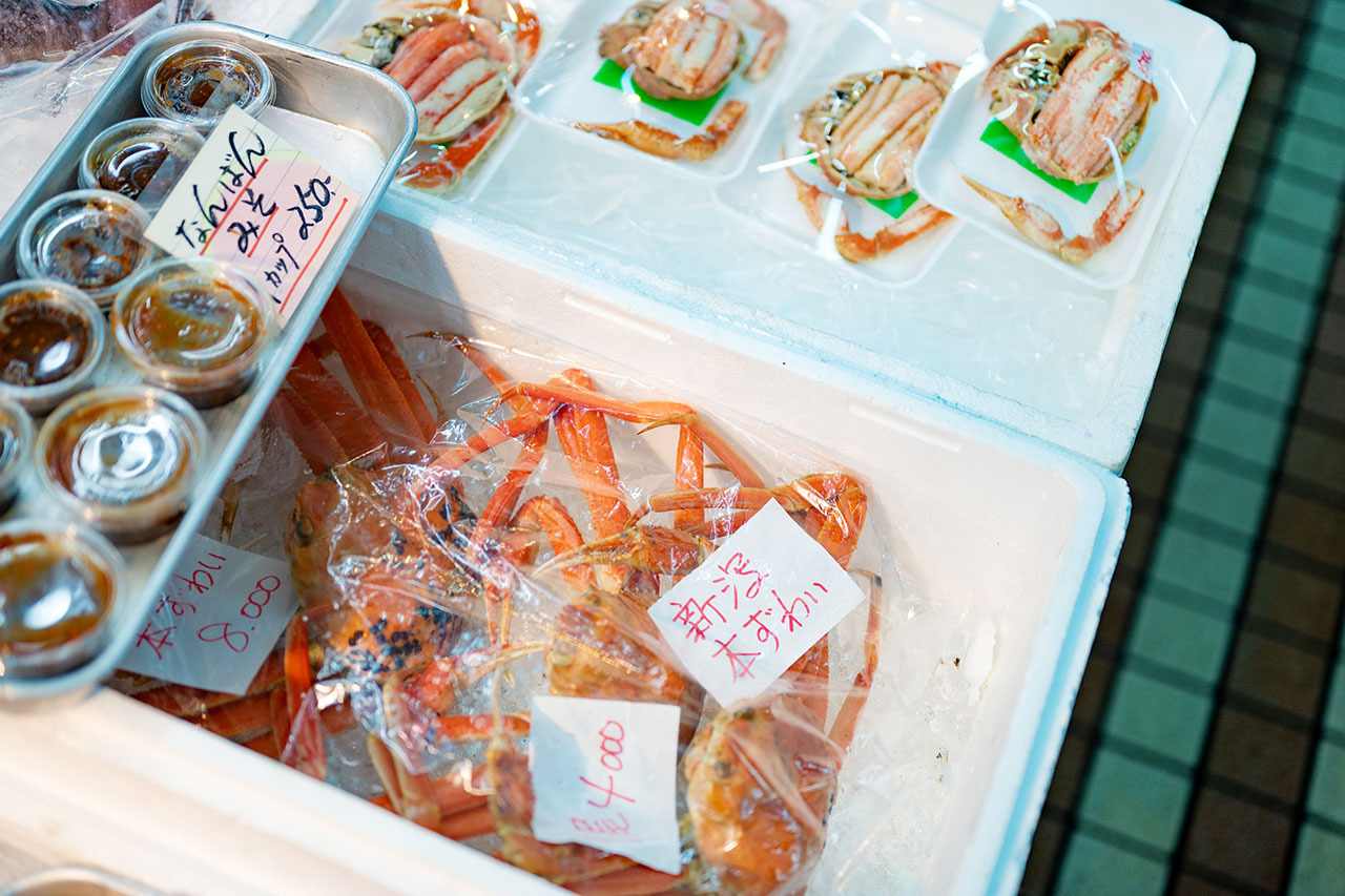 佐渡沖で獲れた魚介を中心に旬の魚が揃う「鈴木鮮魚」へ。店内には飲食スペースもあり、新潟ならではの食材を使ったメニューをいただけます。