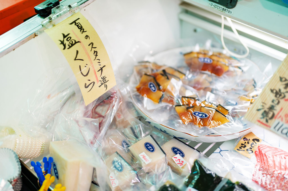 とれたてのノドグロなどその日に採れた地物鮮魚や塩引鮭、鮭焼漬などを市場価格で販売している「古川鮮魚」。気になった魚があれば食べやすいように下ごしらえしてくれます。