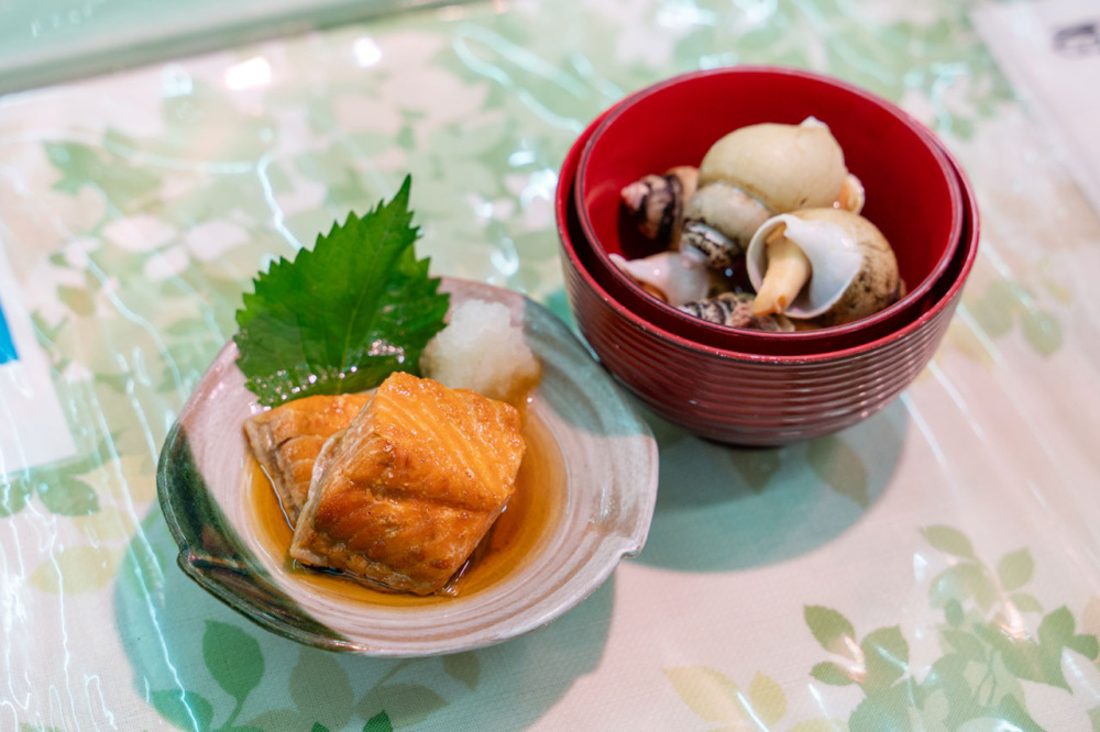 この日のオススメは、新潟でよく食べられているバイ貝の煮付けと、さけの焼漬。