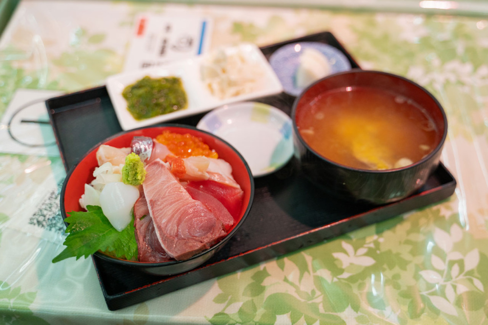 海鮮丼A(1,600円)は、すずきやひらめなど新潟で採れた魚をはじめ新鮮なネタが乗った食べ応えのある一品。つけものやめかぶなど手作りの付け合わせと新潟産のみそを使ったあら汁が付いてきます。佐渡沖で採れたぶりは脂が乗っていて食べ応え抜群。