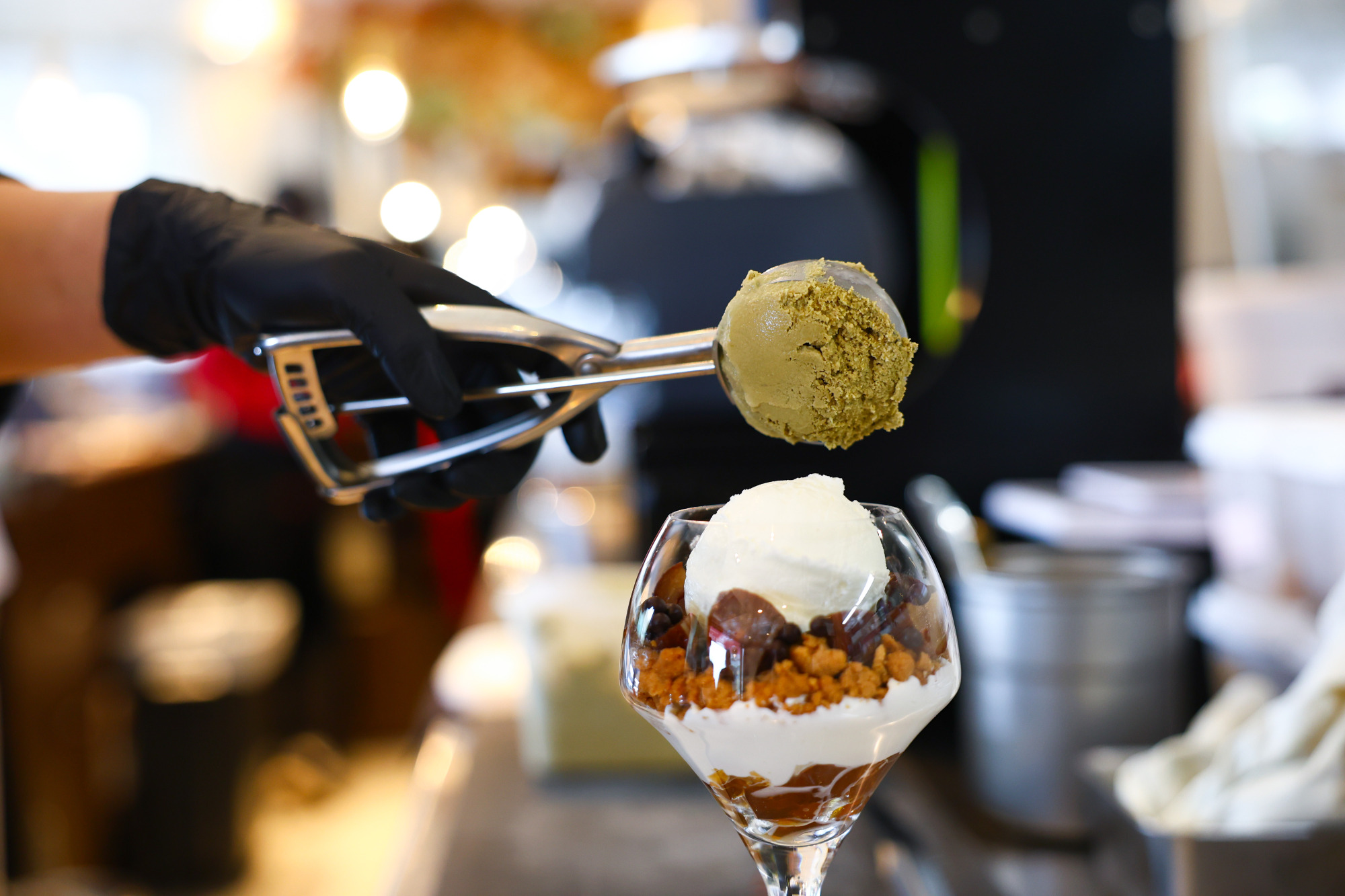 シナモンとほうじ茶が合わさると、まるでチャイのような味わいに。スプーンを進めるたびに異なる味わいと食感が楽しめる計算された一品です。