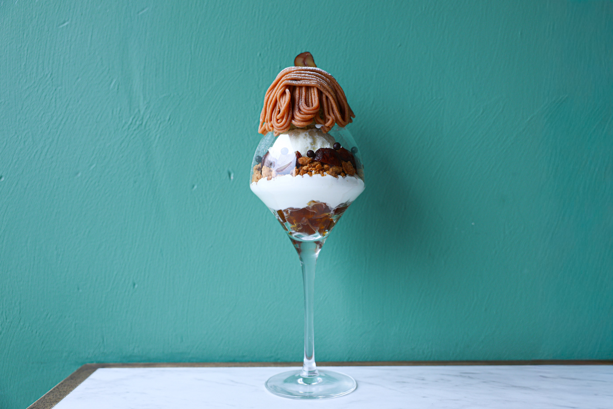 バニラアイス、シナモン香るクランブルや、パフをチョコで包んだパールクラッカン、なめらかなモンブランクリーム、栗の甘露煮が飾られた一品です。