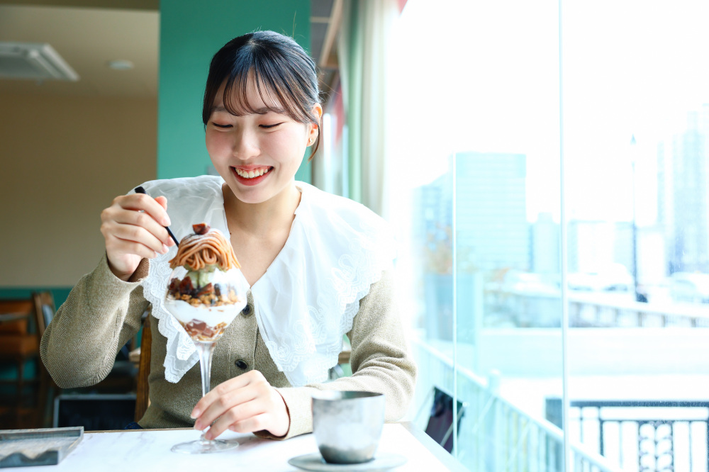 山崎さんが選んだのは、秋から冬にかけて登場する「モンブランと村上富士美園ほうじ茶のパフェ」。茶処として知られる村上市の老舗茶屋、富士美園で作られた希少なほうじ茶をムースやジュレ、アイスに贅沢に使用しています。