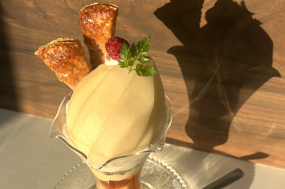 冬の人気は新潟のブランド洋梨「ル レクチエ」を使った「ル レクチェパフェ」。豊かな香りとみずみずしさ、なめらかな食感が特徴です。パフェには、ビタミンD強化卵を使った濃厚なバニラアイス、洋梨ムース、パイ、キャラメルソースなどをトッピング。果物とたまごのおいしさを一度に楽しめる贅沢な一品です。