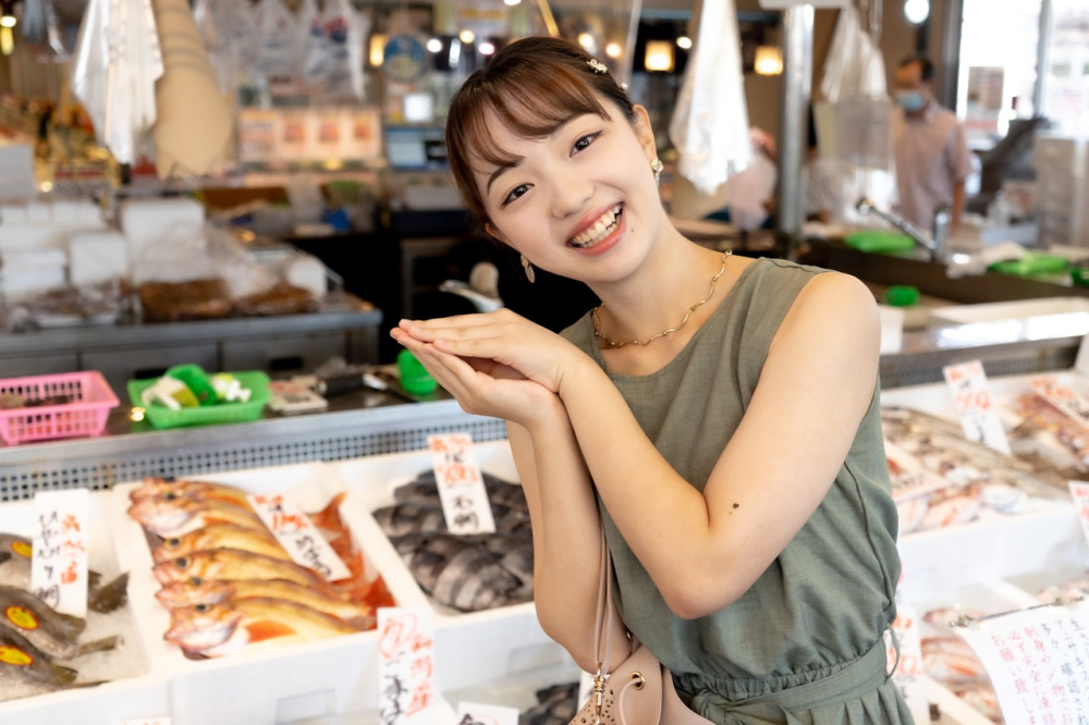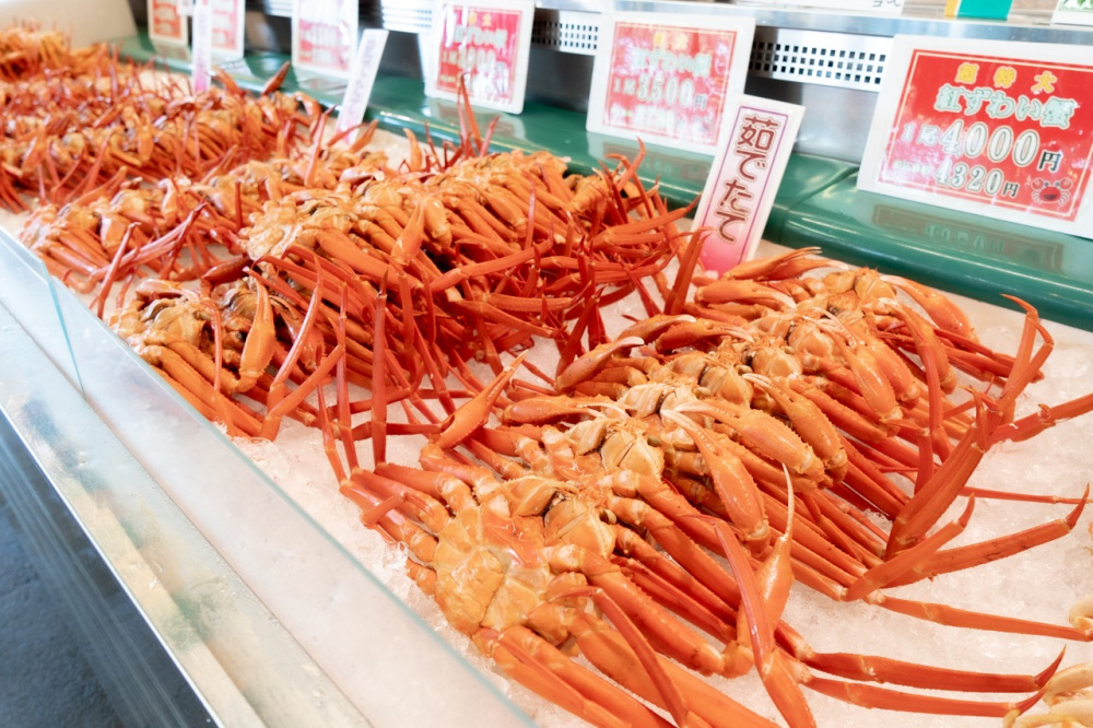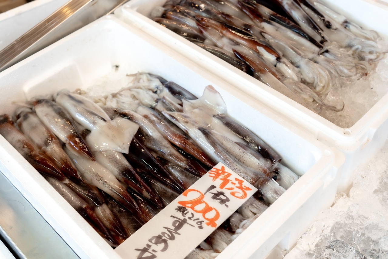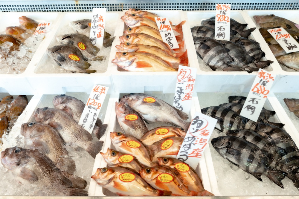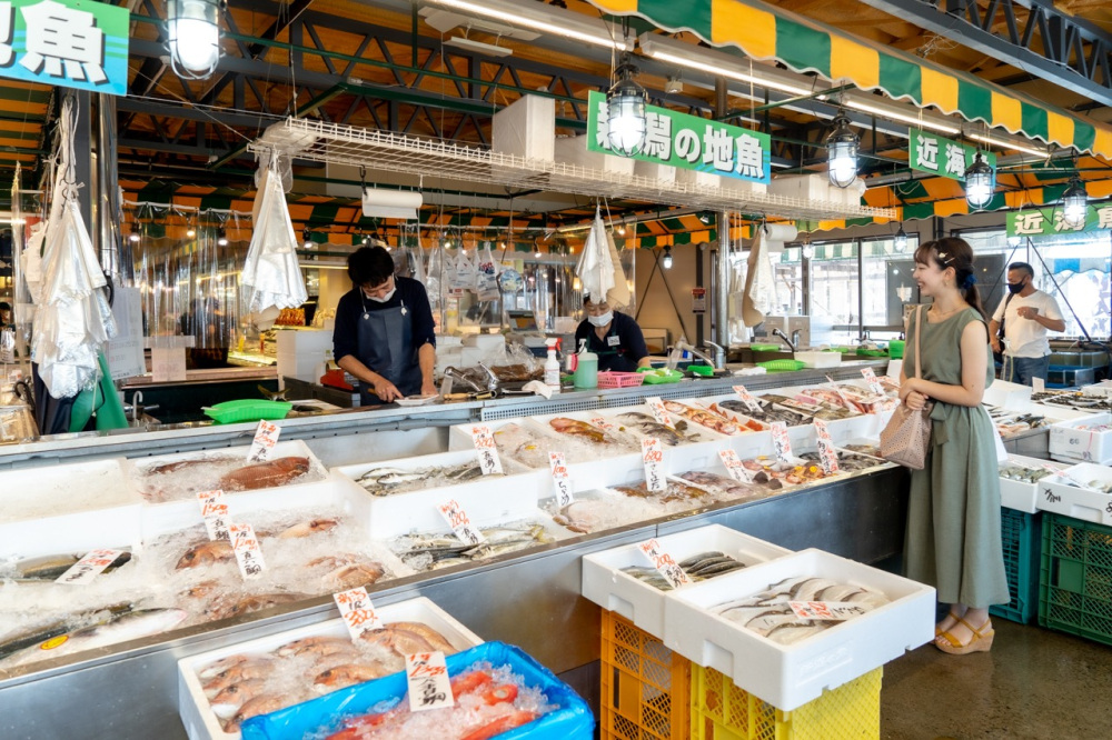 「万代島鮮魚センター」では、日本海で水揚げされる新鮮な地魚や、全国の水産物が市場価格で並んでいます。