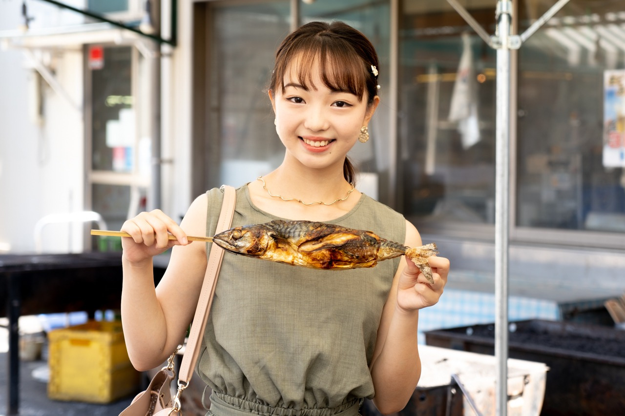 新鮮な魚や貝を炭火で焼く浜焼きも人気。この日のおススメは脂の乗った鯖でした。