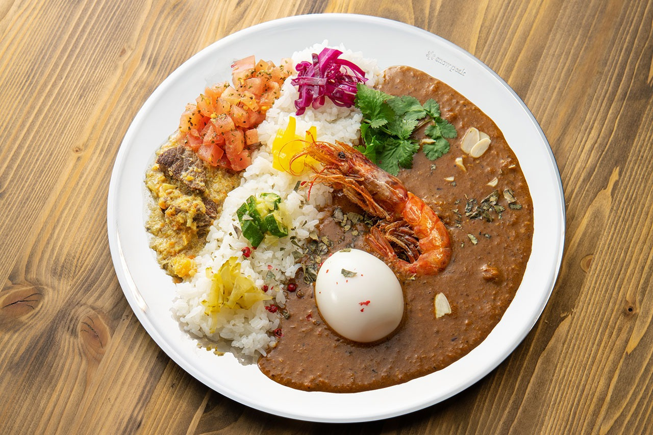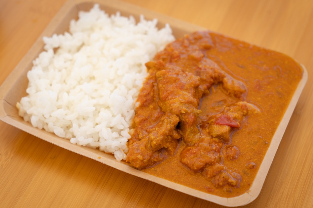 シメには日替わりカレーがついてきます。この日はトマトバターチキンカレー(写真左)。6~7種類のスパイスで作るカレーにトマトの酸味や甘みがプラス。カフェメニューでも本日のスパイスカレー(写真右)は人気の一品です。