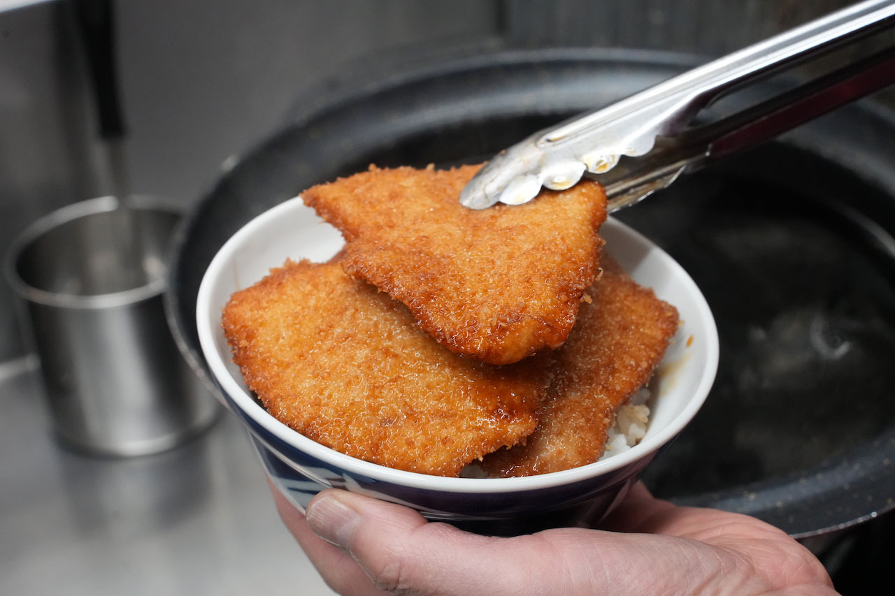 とんかつ太郎では国産豚のもも肉を使ったカツレツをラードで揚げて、秘伝のタレにくぐらせたタレかつを県産のコシヒカリの上にのせています。薄くすることでサクッとする食感を楽しめるそう。昭和初期の創業から継ぎ足しで守られているタレとジューシーなかつの旨み、甘味のあるごはんが合わさって、絶品のかつ丼ができあがります。
