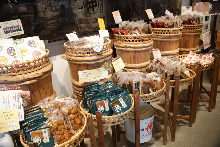 店内に足を踏み入れると、味噌だけでなく、漬物、調味料や惣菜などの商品が出迎えてくれます。長年培ってきた伝統の発酵技術を生かし、定番からオリジナリティあふれる商品まで、バラエティ豊富な商品が並びます。