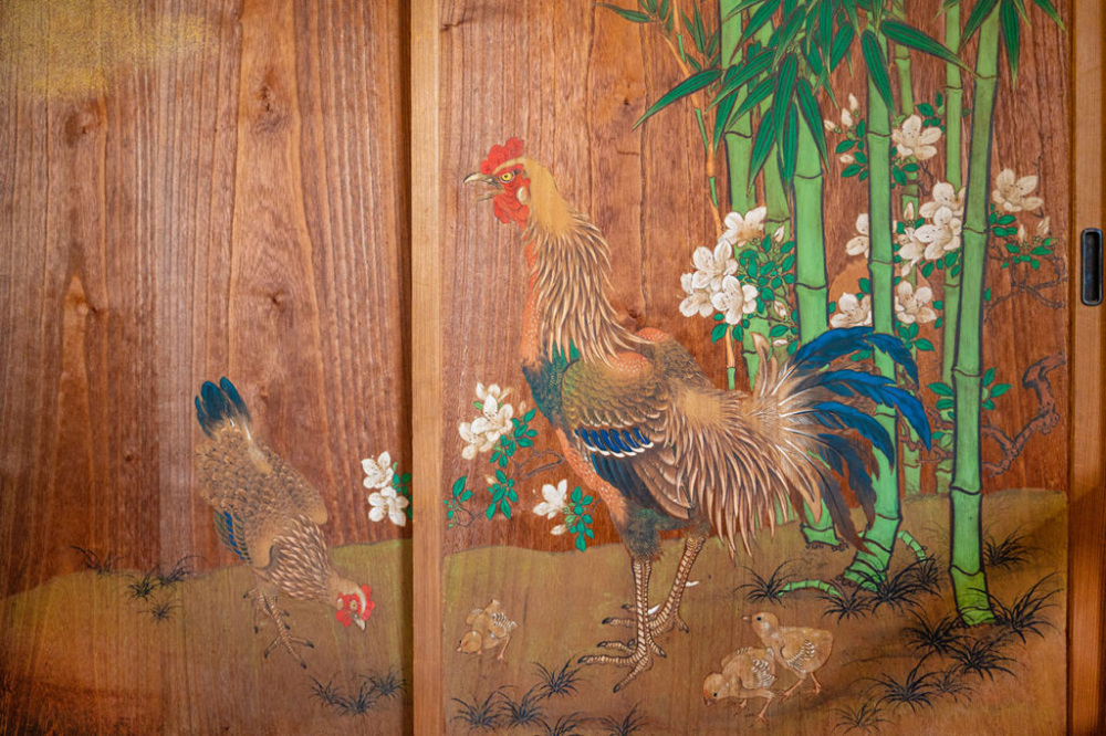 廊下にある桐の鏡板に描かれている板戸絵は、大正時代の日本画家佐藤紫煙の作品。リアルな描写と鮮やかな色彩を近くで見ることができます。タイミングがよければ、ボランティアや学芸員から、ガイドをしてもらうことも。解説付きでじっくり見たい人は受付へ。