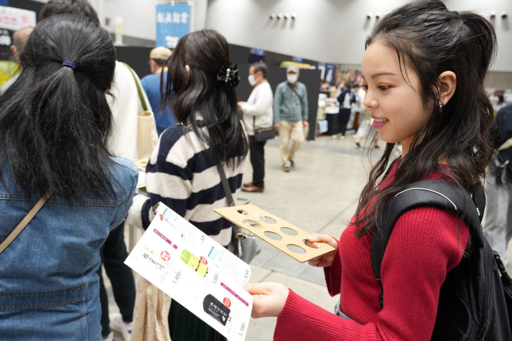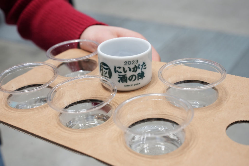 大活躍するのが、入り口で提供されるボード。試飲用カップがすっぽり入ります!移動時や、飲み比べをする際にとても便利ですね。なお、酒の陣限定のおちょこの販売もあります(1個300円、税込)。参加の思い出に、お土産にぜひ!