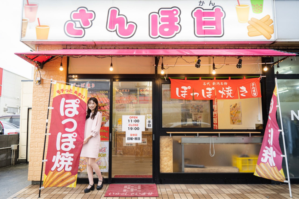 今回、そんなぽっぽ焼きを求めて、第12代にいがた観光親善大使の風間さんと新潟駅南口から徒歩約15分の場所にある「さんぽ甘」にやってきました!