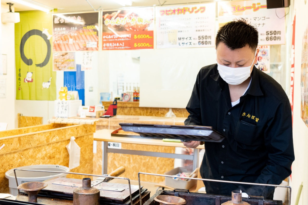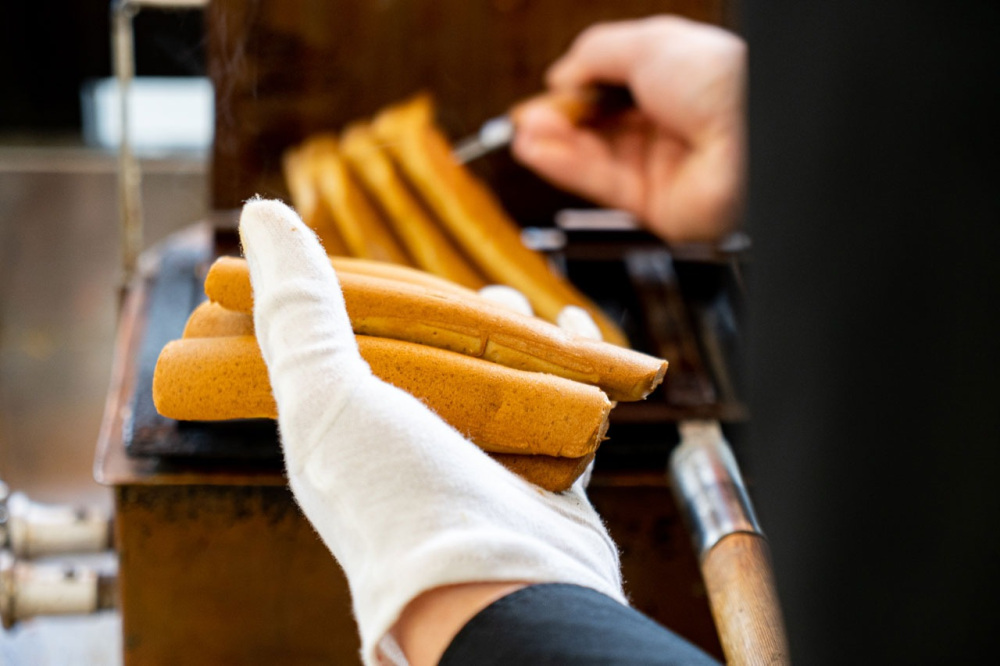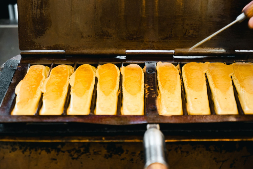 早速、定番のぽっぽ焼きを注文。店内では店長の中野さんが毎日、丁寧に焼き上げます。タイミングが合えば作っている様子を見ることもできますよ。