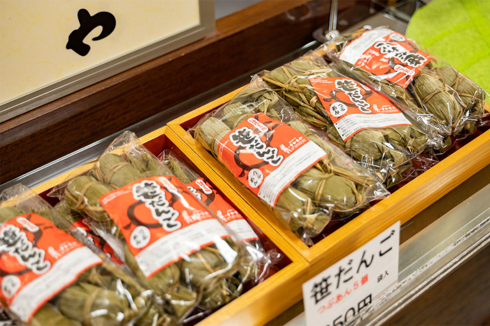 一つひとつ手づくりで丁寧に作られた笹団子が自慢で、人気はつぶあん入り笹団子。原材料は新潟産こがねもち米やコシヒカリなど、出来る限り新潟県内産を厳選して使用しています。5個〜の袋売りのほか、つぶあんは1つから購入可能です。