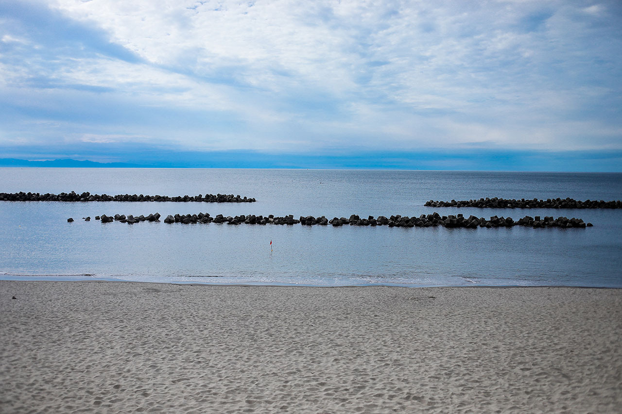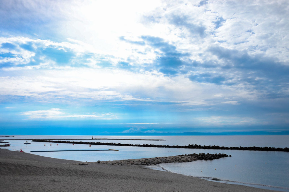 日本海というと荒々しいイメージですが、消波ブロックもあり、波は穏やか。離岸流の心配が少なく安心して泳げるため、夏場は地元の人で賑わいます。