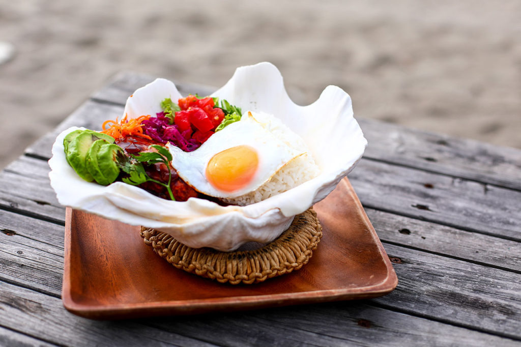 今回注文したのは、「SEKIYAリゾートロコモコ丼(1,180円)」。貝殻の器に盛られた、見た目もオシャレな一皿です。料理はレストランのシェフが監修。調味料や食材にもこだわっているそう。