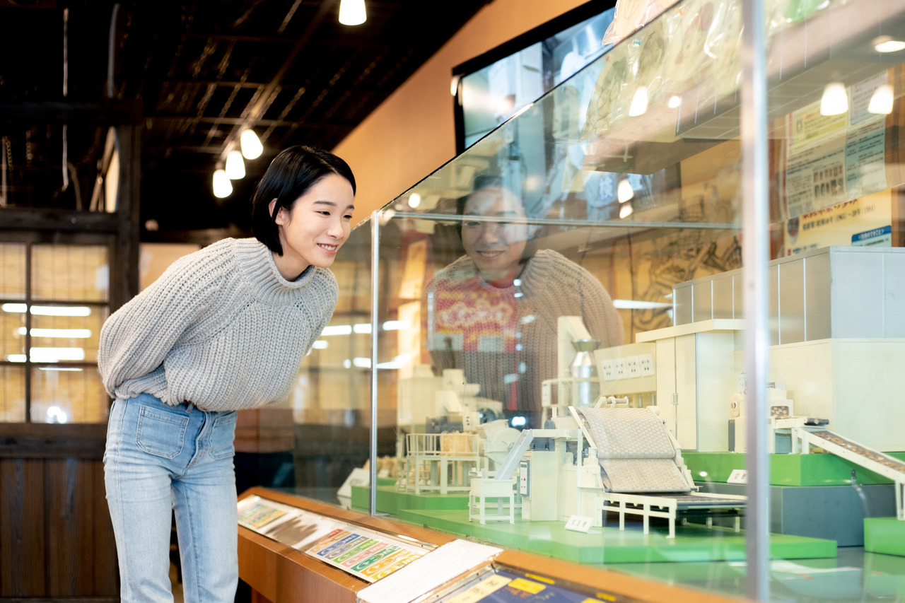 まずは見学!館内には、資料やミニチュア模型が展示されており、新潟の米菓の歴史を学べます。併設している工場では見学もでき、タイミングが合えば職人さんがせんべいを手焼きしている様子も見れますよ!