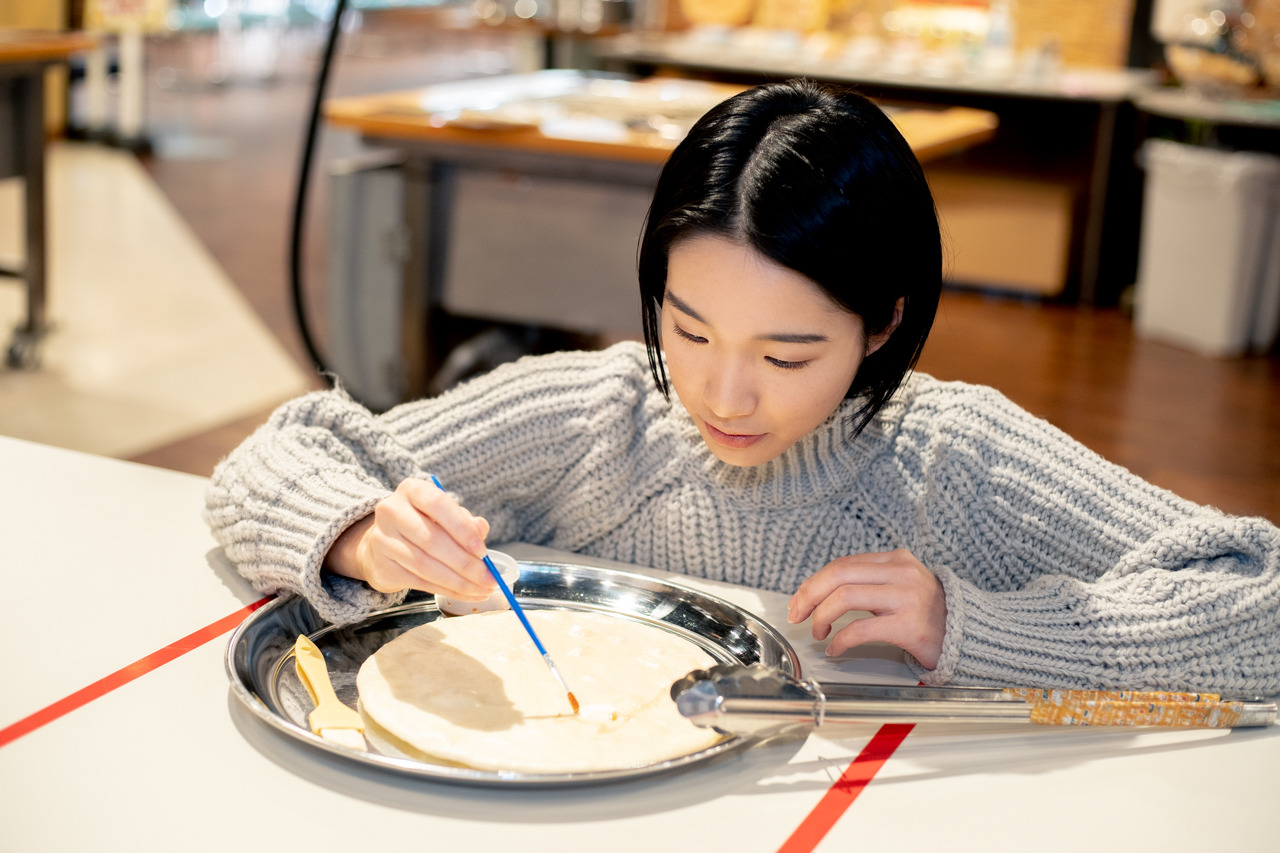 生地が膨らんできたら、醤油で絵を描いていきます。何を描いてもいいので、考える時間も楽しい!清さんは飼っている猫を描くことに。