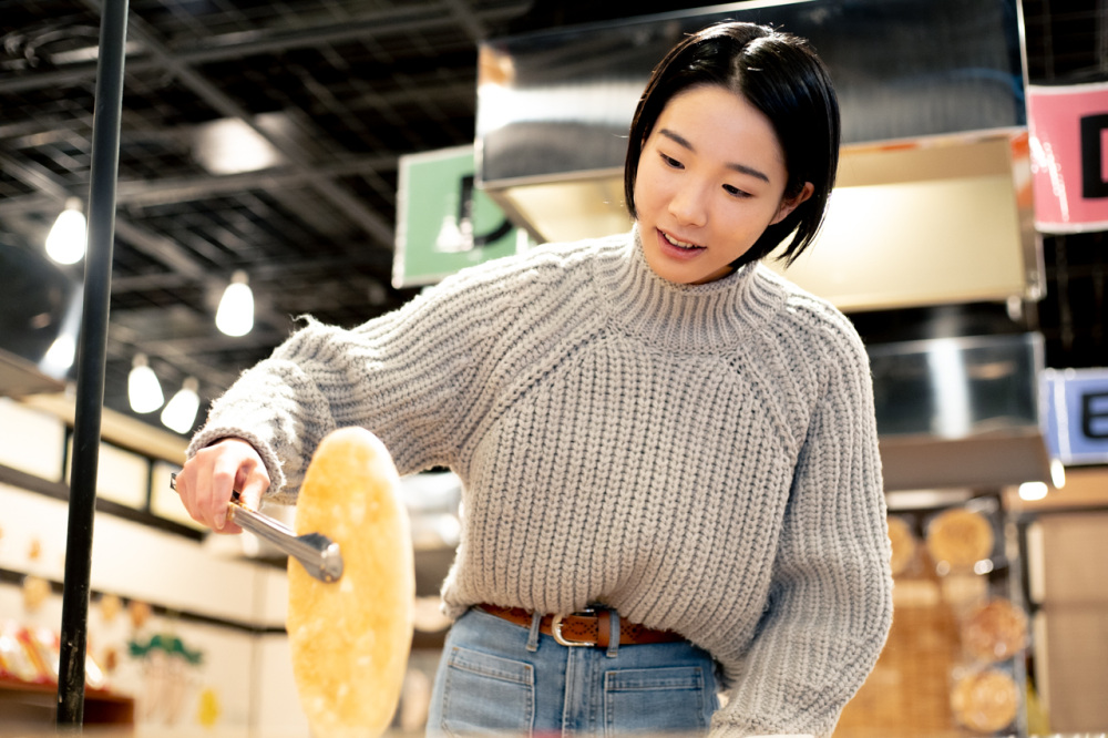 スタッフさんの説明を聞きながら、まずは直径約25cmの生地を手早くひっくり返し温めていきます。満遍なく熱を加えるため何度も裏返すのが、綺麗に仕上げるポイント。