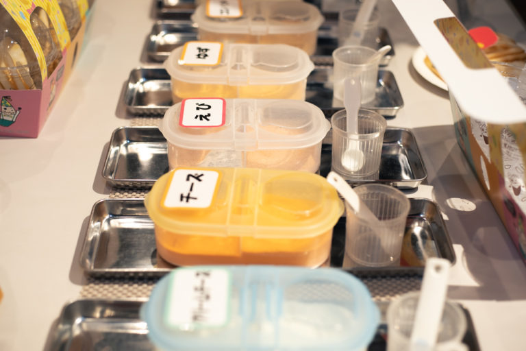 おせんべいにかけるパウダーは1カップにつき1種類。コンソメやクリームチーズなどの定番から期間限定の味を含めると8~10種類もあり、思わず迷ってしまいます。