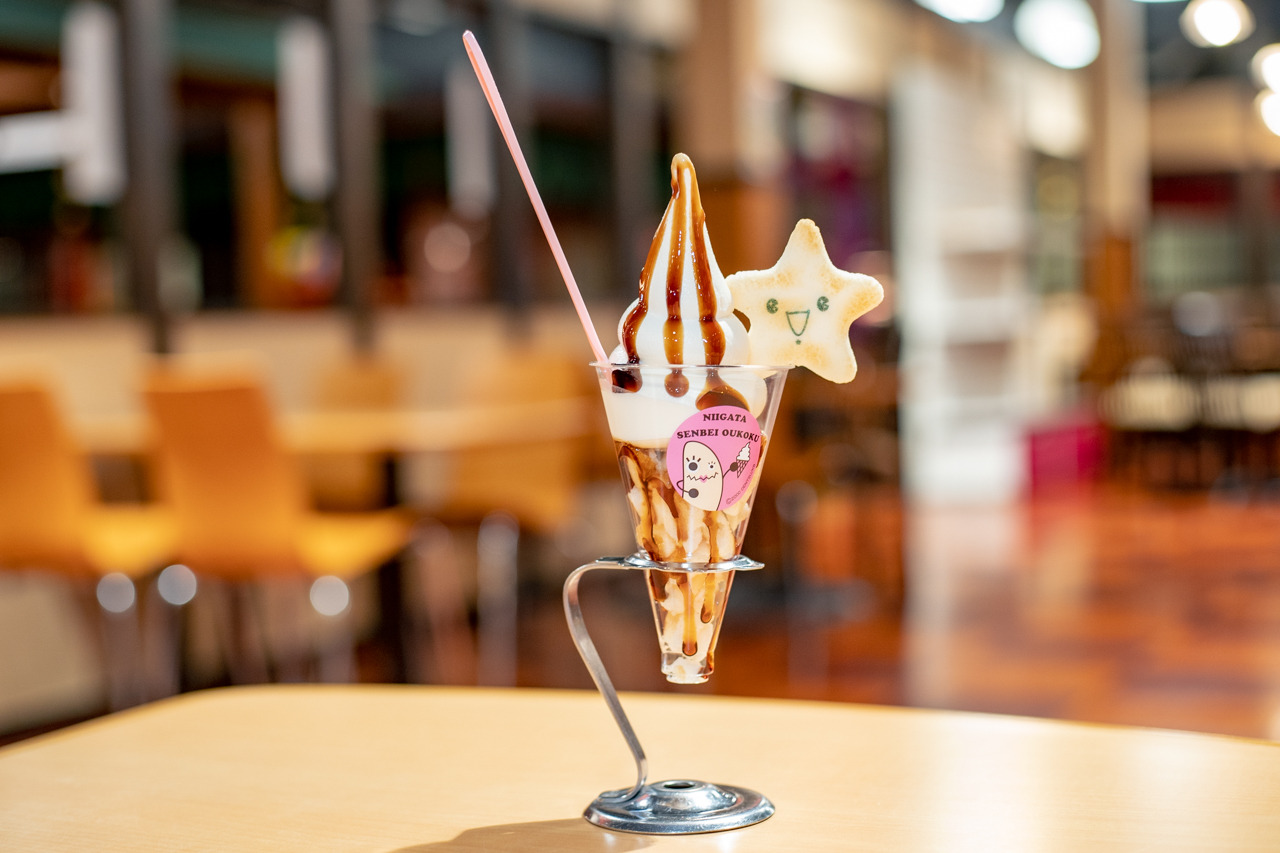 ソフトクリームにかかった甘しょっぱい特製醤油とサクサクのせんべいが、いいアクセントになっています。