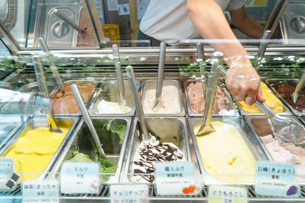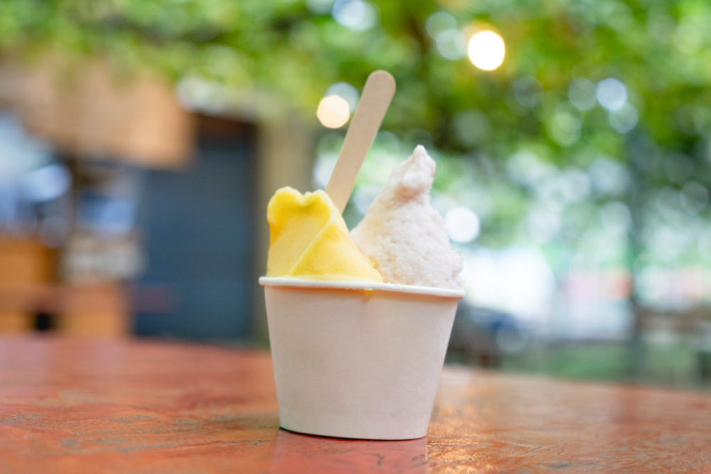 農園で採れた果物や地場産の食材を使った、卵不使用のジェラートは子どもにも大人にも大人気。画像はダブル400円(左:パッションフルーツ、右:桃)