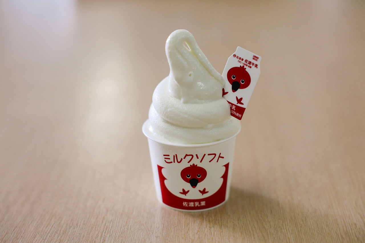 「のりば食堂しおさい」で注目したいのは、新潟市内で「佐渡汽船 新潟港ターミナル」だけでしか食べられない「佐渡ミルクソフトクリーム」。カップやピックには佐渡牛乳のパッケージの柄がデザイン。佐渡牛乳を使った濃厚な味わいが特徴です。